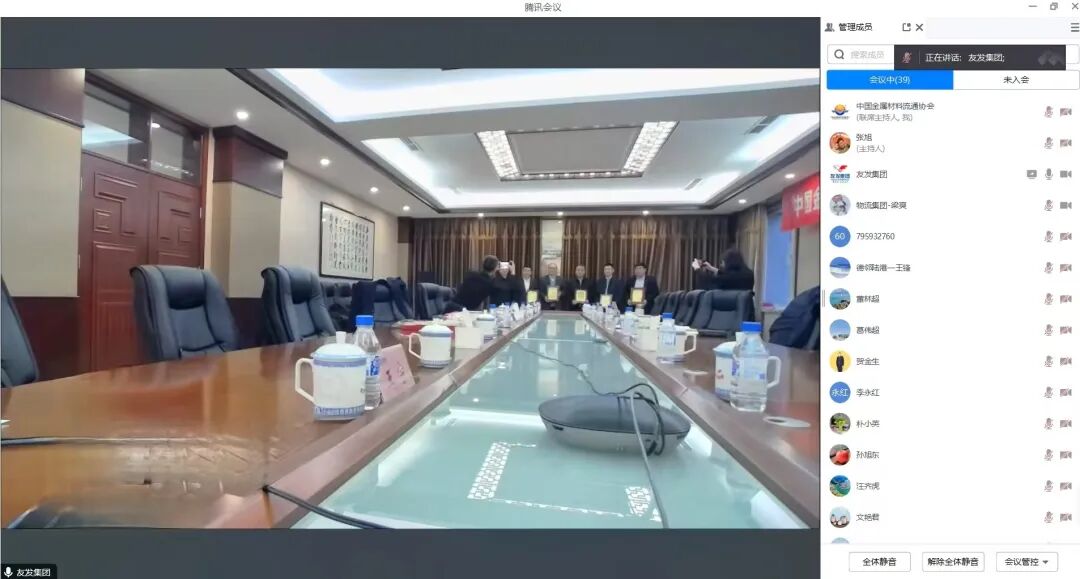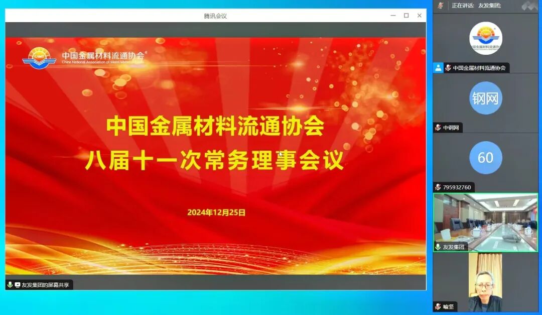 12月25日下午,中国金属材料流通协会八届十一次常务理事会议在天津友发钢管集团通过线上线下方式成功召开。党支部书记陈雷鸣,联席会长、2024年度轮值会长、华南物资集团有限公司董事、总裁李刚,联席会长、2025年度轮值会长、天津友发钢管集团董事长李茂津,联席会长单位、欧冶云商股份有限公司董事长吕军,联席会长、沙钢集团副总经理王科,联席会长、河北物流产业集团有限公司总经理助理孙继承出席了会议。副会长、常务理事通过线上参加了会议。