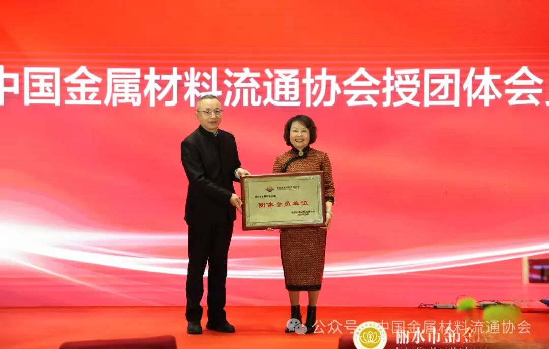 陈雷鸣为丽水市金属行业协会颁发了“中国金属材料流通协会团体会员单位”牌匾,周妙翠代表该会接受授牌。